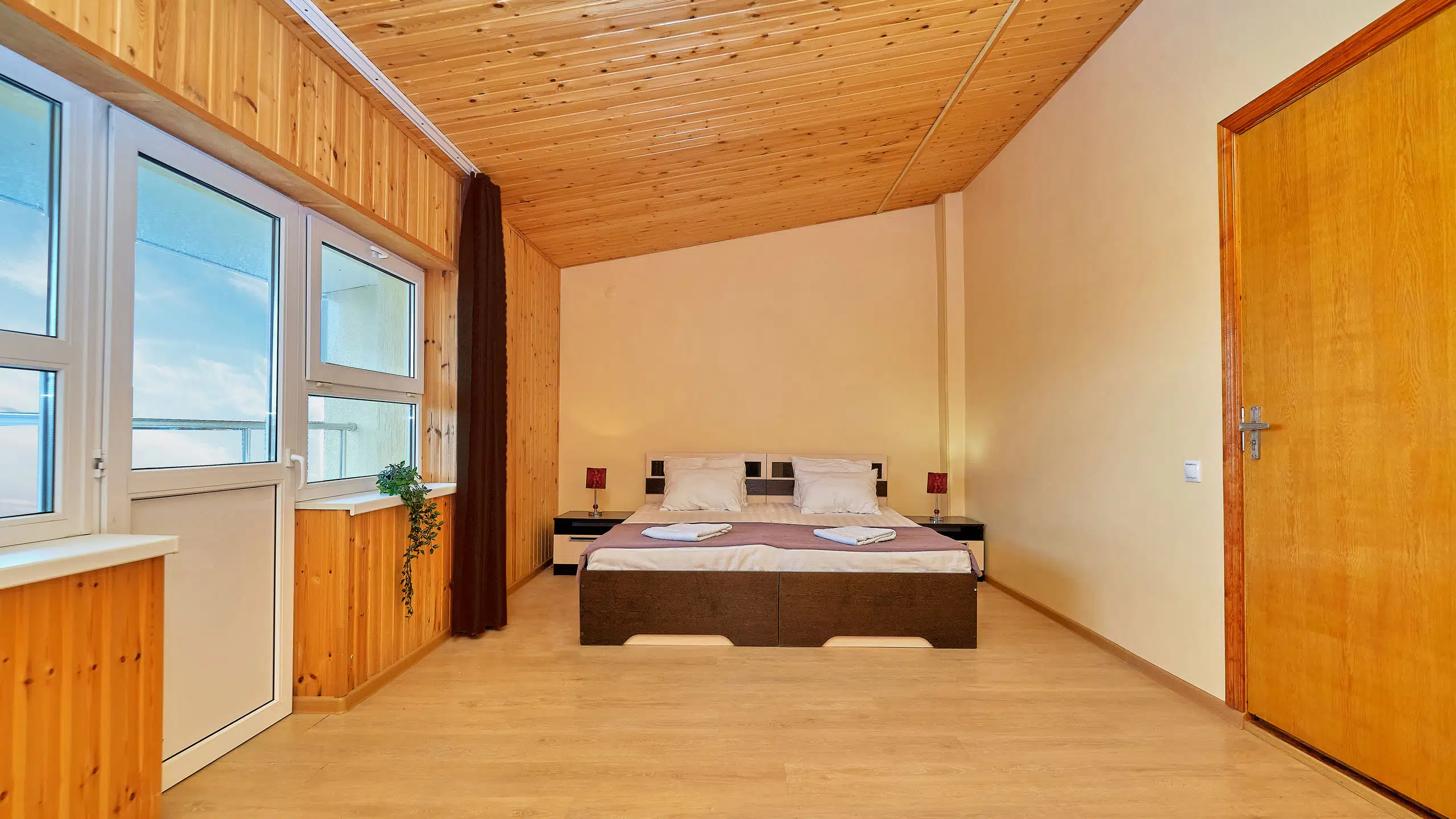 Номер предусматривает шестиместное размещение: 4 основных места и 2 дополнительных. Номер очень просторный и светлый. Прекрасно подходит для большой семьи. В номере одна двуспальная кровать в одной комнате; две односпальных кровати в другой комнате, а также 2 кресла-кровати, 2 балкона. Вид из окна открывает панораму моря.